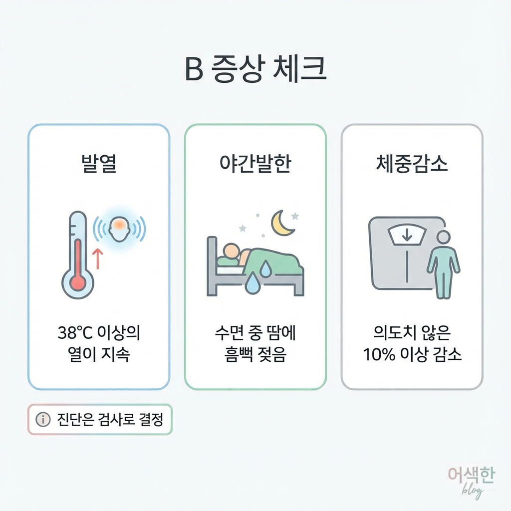 원인 없는 발열, 밤에 땀이 흠뻑 나는 야간발한, 의도치 않은 체중 감소는 림프종에서 자주 언급되는 경고 신호로 알려져 있습니다. 🌙💦