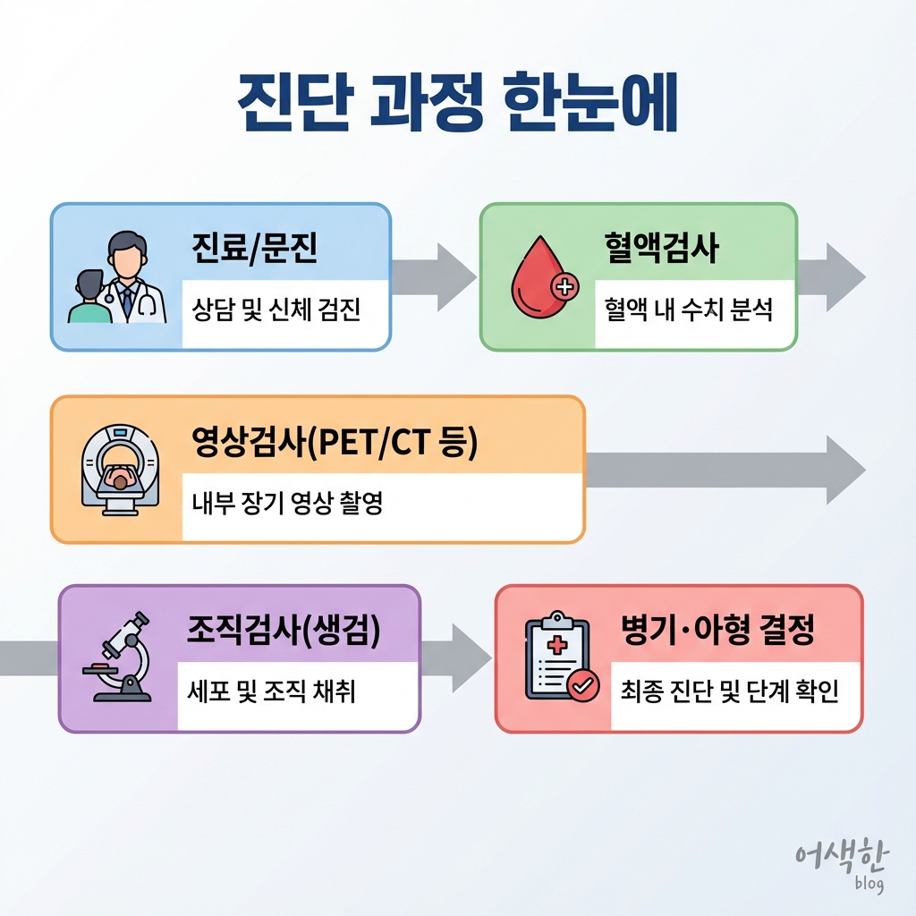 특히 최종 확정에는 조직검사(생검)가 핵심으로 언급되며, 아형과 병기를 정하는 과정이 중요합니다.