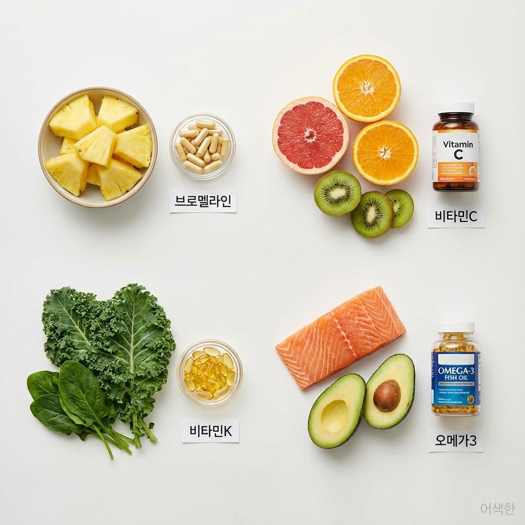 A7. 브로멜라인은 파인애플에서 추출한 효소로 항염증 및 항부종 효과가 있어 멍과 부기를 줄이는 데 도움이 됩니다. 하루 200~400mg을 3회 복용하면 멍이 빠르게 해소되는 효과가 있습니다. 비타민K는 혈액 응고 과정에서 중요한 역할을 하며, 지혈을 도와 멍이 더 커지는 것을 방지합니다. 다만 항응고제를 복용 중이거나 특정 질환이 있는 경우 전문의와 상담 후 복용해야 합니다.