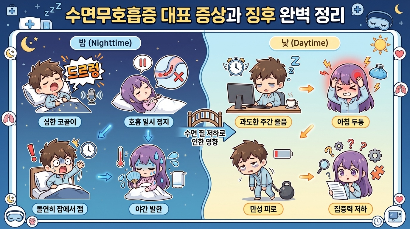 수면 무호흡증이 의심되시나요? 😴 자는 동안 숨이 멈추거나 심한 코골이, 아침에 일어나도 개운하지 않은 피로감을 느끼신다면 수면무호흡증 증세일 수 있습니다. 이 질환은 단순한 수면 문제를 넘어 고혈압, 심혈관 질환, 뇌졸중 등 심각한 합병증을 유발할 수 있어 조기 진단과 치료가 중요합니다. 이 글에서 수면무호흡증의 증상부터 원인, 자가진단, 치료방법까지 상세히 알아보겠습니다.
