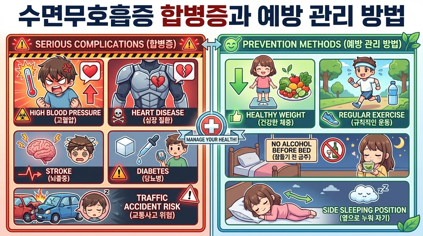 예방과 관리를 위해서는 적정 체중을 유지하는 것이 가장 중요합니다. 규칙적인 운동과 균형 잡힌 식단으로 비만을 예방하고, 취침 전 음주와 흡연을 삼가야 합니다. 옆으로 눕는 수면 자세가 도움이 되며, 규칙적인 수면 습관을 유지하는 것도 중요합니다. 코골이가 심하거나 주간졸음이 있다면 미루지 말고 전문의 상담을 받으시기 바랍니다. 🩺