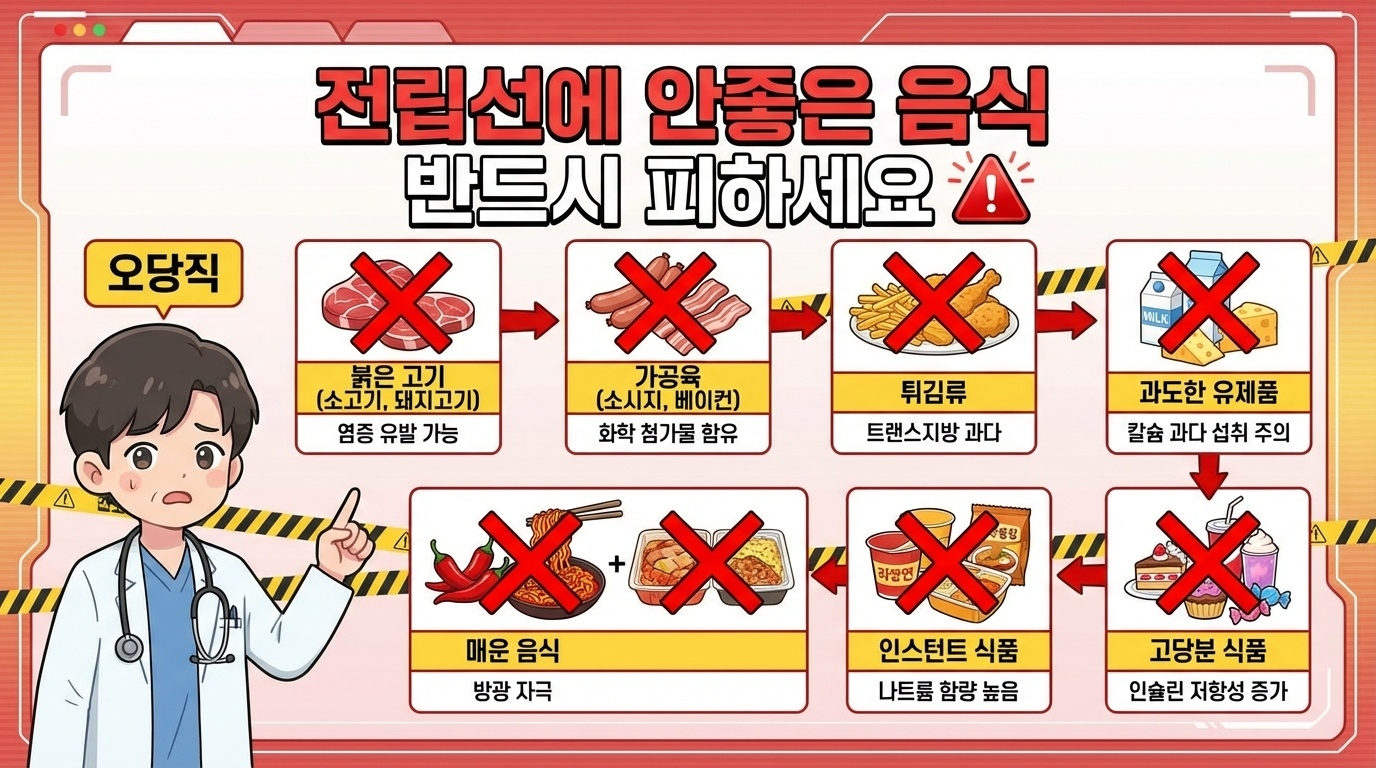 A2. 적색육(소고기, 돼지고기), 가공육(소시지, 베이컨), 튀김 음식, 고지방 식품, 인스턴트 식품이 전립선 건강에 해롭습니다. 맵고 짠 음식과 고당분 식품도 피하는 것이 좋습니다.