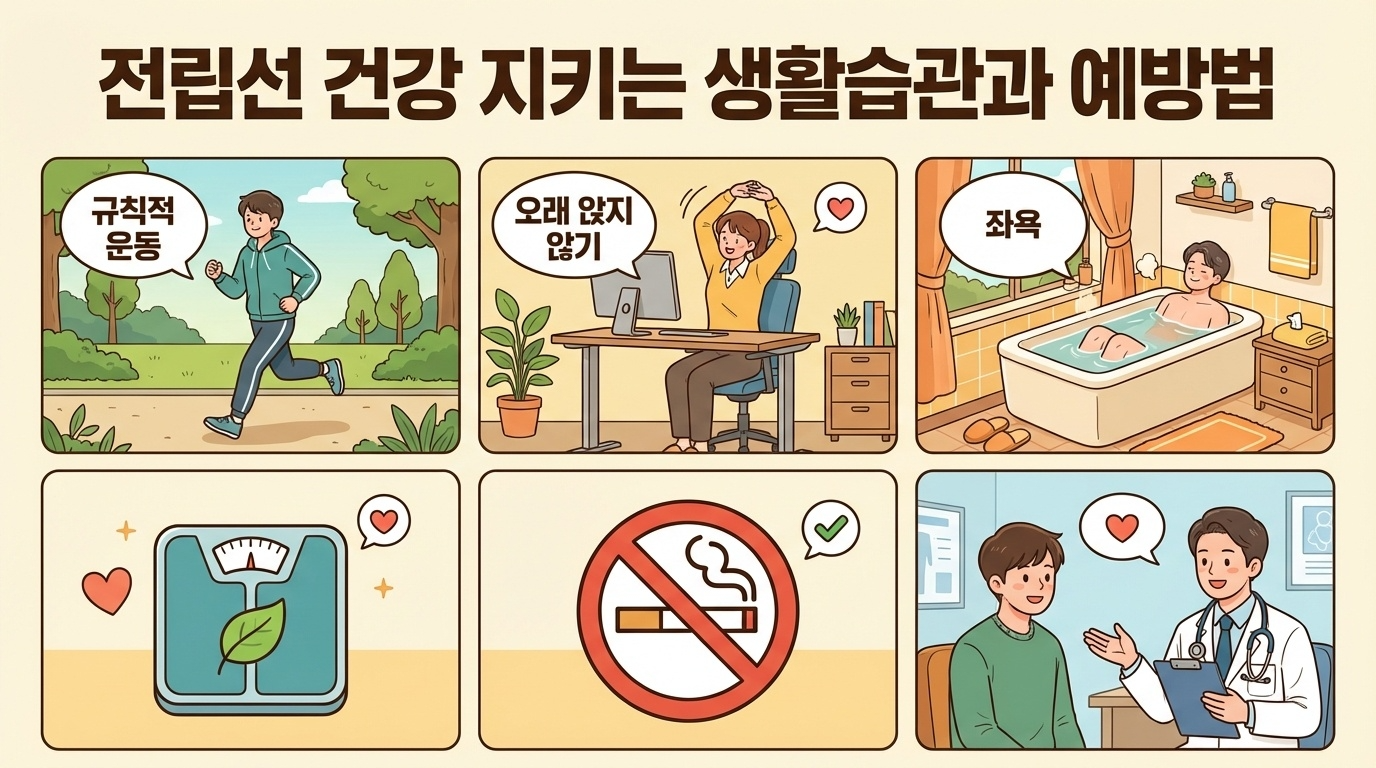 A5. 매일 30분 이상 유산소 운동, 장시간 앉지 않기, 따뜻한 물로 좌욕하기, 적정 체중 유지, 금연, 정기 검진이 전립선 건강에 도움이 됩니다.