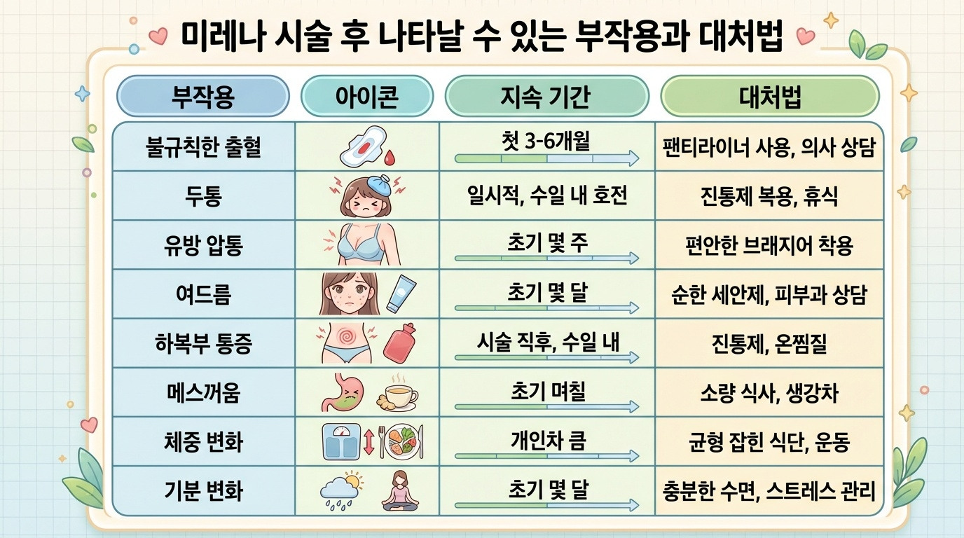 미레나는 안전한 시술이지만, 초기에는 몇 가지 부작용을 경험할 수 있습니다. 아래 표를 통해 주요 부작용과 대처 방법을 확인해 보세요.