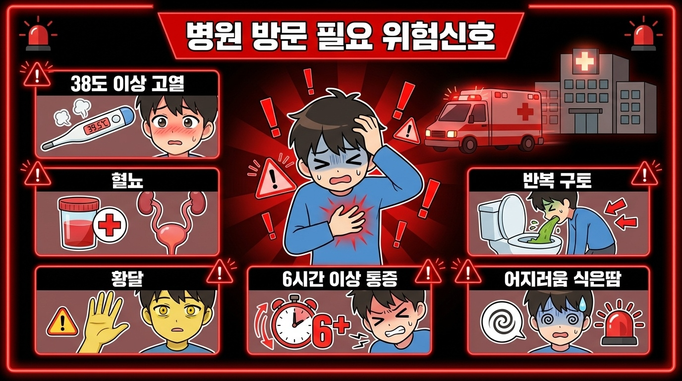오른쪽 옆구리 통증이 모두 응급 상황인 것은 아닙니다. 하지만 특정 증상이 동반되면 빠른 시간 내에 병원을 방문해야 합니다. 다음과 같은 위험 신호가 있다면 지체하지 말고 진료를 받으세요 🚨
