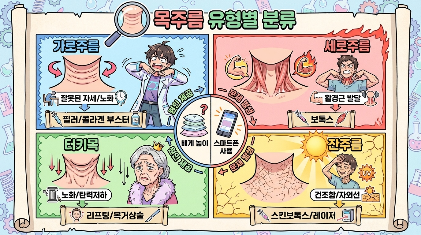 | 가로주름 | 목을 가로지르는 선 형태 | 잘못된 자세, 노화 | 필러, 콜라겐 부스터 |