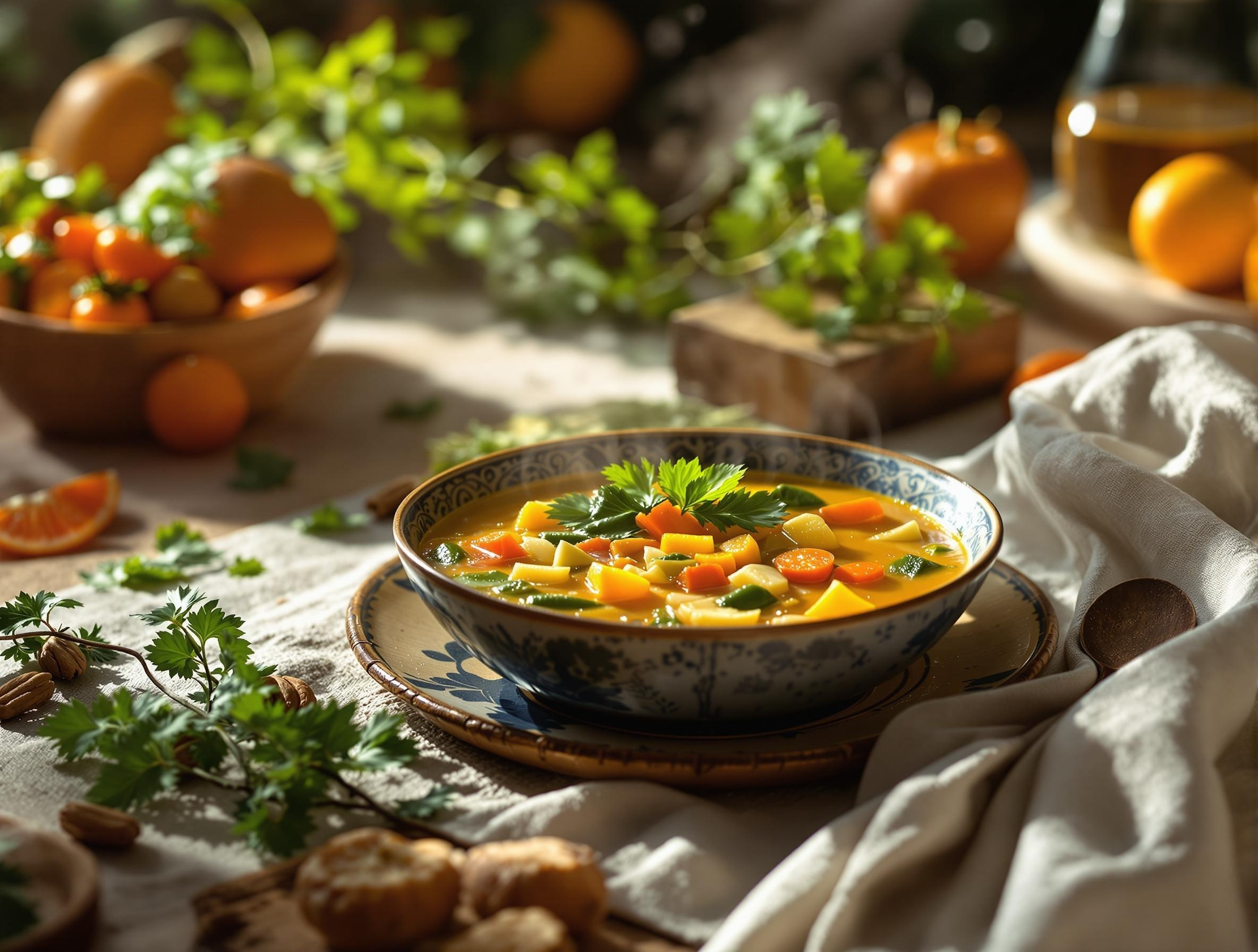 채소 수프는 몸을 따뜻하게 해주고 수분 보충에도 좋아요. 양파, 당근, 셀러리, 감자를 적당히 썰어 올리브오일에 볶아요. 채소 육수나 물을 붓고 20분 정도 끓인 후, 토마토와 시금치를 넣어요. 마지막에 파슬리와 후추로 간을 맞추면 돼요. 이 수프는 칼로리가 낮으면서도 포만감이 있어 저녁 식사로 좋아요. 남은 수프는 냉장 보관했다가 다음날 먹어도 맛있어요.